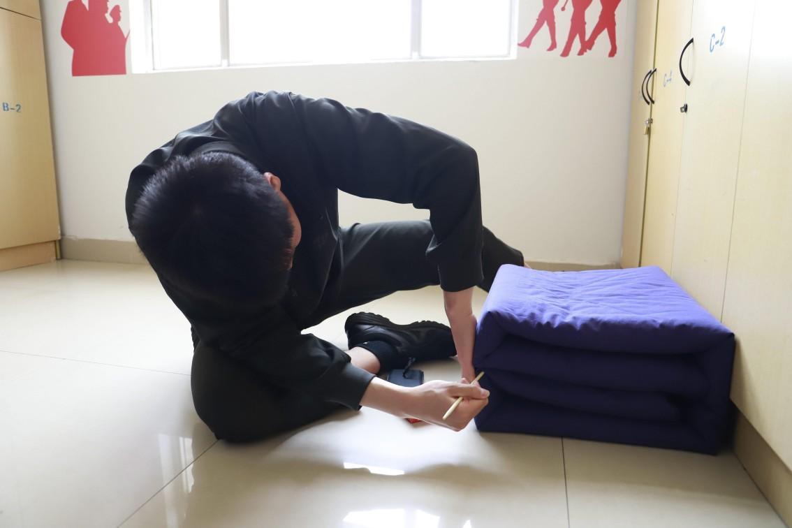 在學(xué)院生活管理部的統(tǒng)籌安排下,20余名學(xué)生骨干有序前往退役士兵宿舍參觀學(xué)習。當宿舍門被推開的那一刻,標準化的內(nèi)務(wù)環(huán)境令人眼前一亮:床鋪之上,棱角分明的 “豆腐塊” 軍被擺放整齊;書桌表面,學(xué)習用品分類有序;地面光潔如新,毫無雜物堆積;宿舍墻壁上還有全體舍員的介紹。這些細節(jié),無不彰顯著軍營生活嚴謹細致的優(yōu)良作風。退役士兵王磊現(xiàn)場進行軍被折疊技巧演示,他動作嫻熟,邊操作邊講解,讓同學(xué)們直觀、清晰地掌握了內(nèi)務(wù)整理的技能要點。
