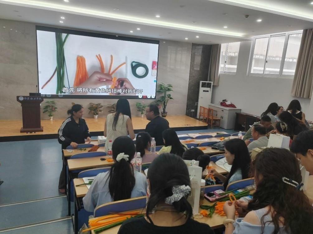 活動(dòng)中,學(xué)生們發(fā)揮專業(yè)特長(zhǎng),指導(dǎo)青海教師們運(yùn)用扭扭棒、編織繩等創(chuàng)作向日葵系列生物學(xué)教具。從花蕊的編織到花瓣的定型,從色彩搭配到花束捆扎,每一個(gè)環(huán)節(jié)都展現(xiàn)了師范生扎實(shí)的勞動(dòng)技能和創(chuàng)造性勞動(dòng)素養(yǎng)。學(xué)生們還把親手制作的節(jié)日花束獻(xiàn)給來(lái)自遠(yuǎn)方的老師。